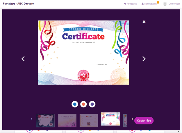 In Footsteps 2 you are able to celebrate each child's accomplishments by designing and awarding certificates. These can be printed or emailed, enabling you to share the child's success with their parents/carers.