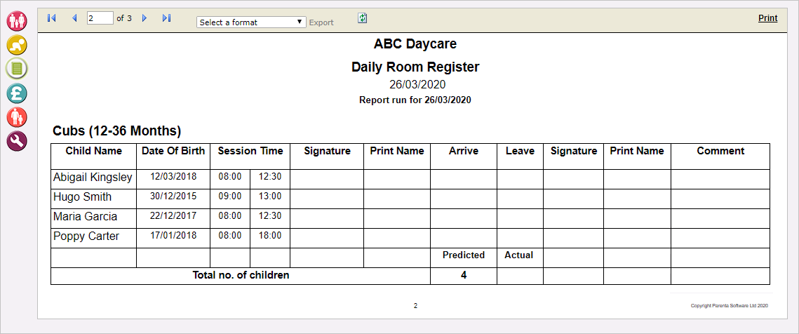The Daily Room Register shows the children due to attend in each room on a selected date. The register includes each child's name, date of birth and session times, along with a space for staff/parents to write-in the actual arrival and departure ...