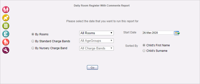 The Daily Room Register by Session report shows the session types which have been booked in each room over a selected date range. For each session type you can see the names of the children and the times they are due to attend. To view the Daily Room ...
