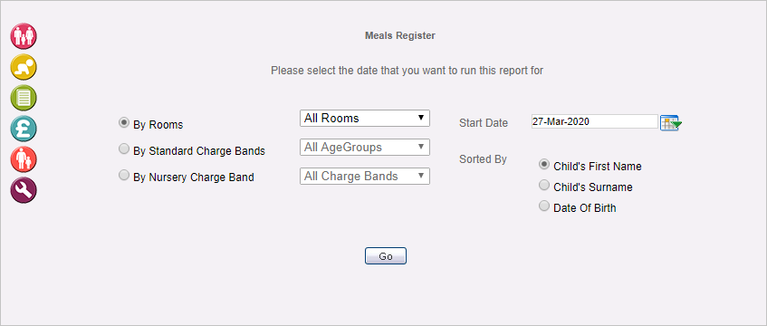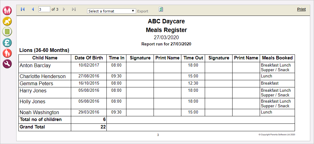 The Daily Summary Register prints a list of all children due to attend today. The report will show the child's name, date of birth, session times and meals required, along with space for a parent/carer or staff member to sign and print their name on ...