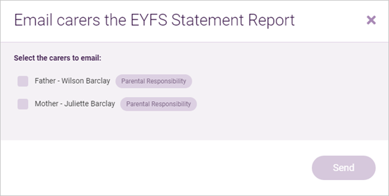 The names of the child's parents/carers, who have an email address in Abacus, will be displayed. Click on the checkbox next to a carer's name to select them.